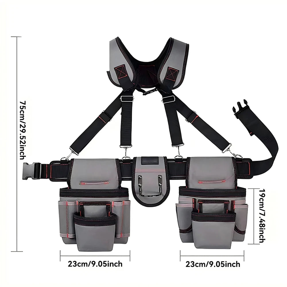 Tool Belt System: This tool belt is designed with the user’s comfort in mind, The Suspenders And Waist Belt Are Fully Adjustable, the Straps Are Equipped With Adjustable Buckles To Suit People Of Different Body Types. The ergonomic design evenly distributes the weight of the tools, reducing strain and fatigue during extended periods of use.