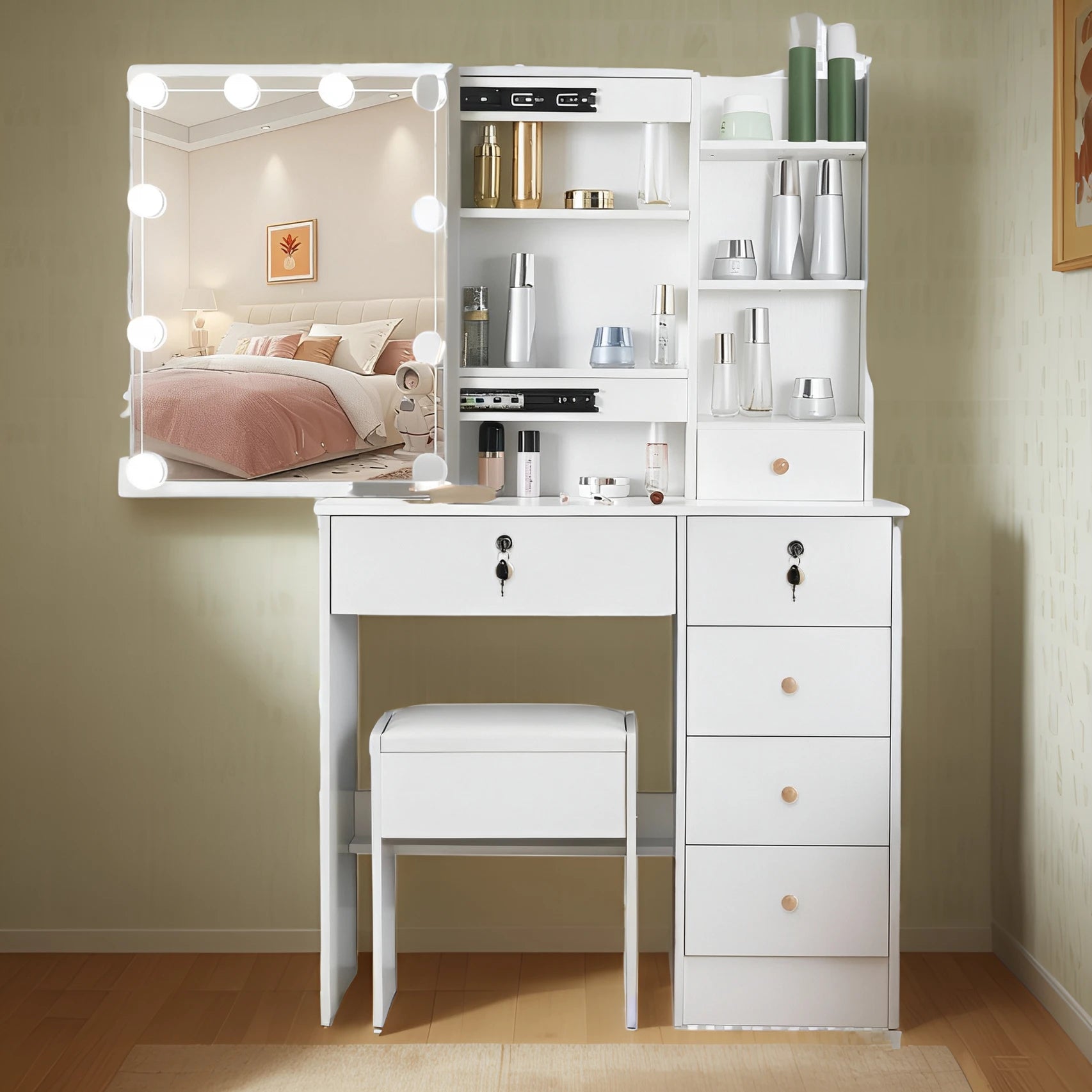 White LED Dressing Makeup Table Bedroom Vanity Set with LED Mirror Stool Drawers