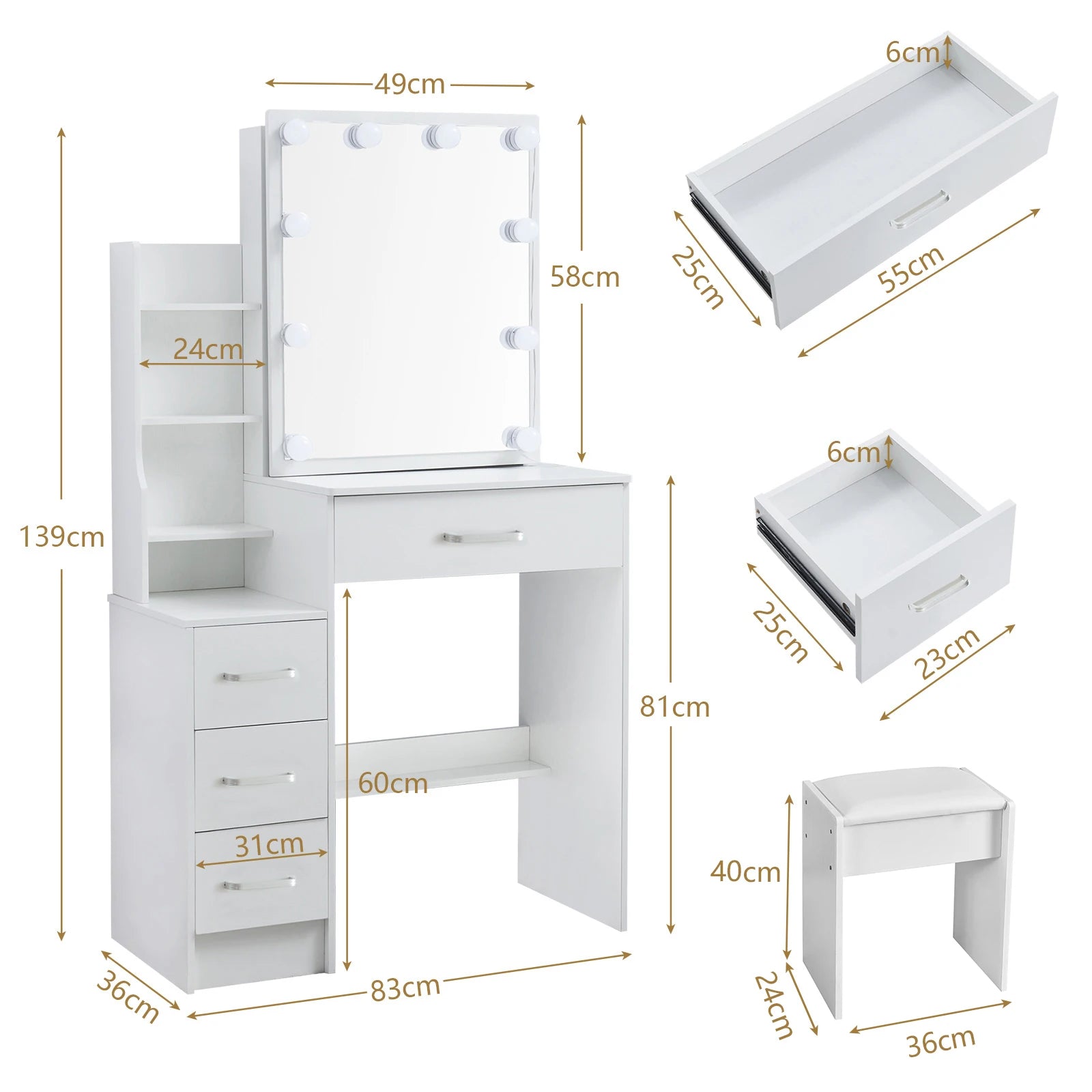 White Makeup Dressing Table W/ Lights Sliding Mirror 4 Drawers Vanity Desk Stool