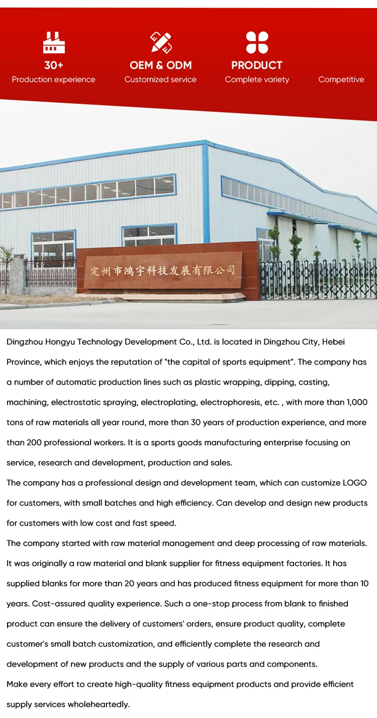 Dingzhou Hongyu Technology Development Co., Ltd. Is Located In Hebei Dingzhou Industrial Park, Which Called The Capital Of Sports Equipment. Our Company Has Many Automatic Production Lines Such As Rubber Coating, Plastic Dipping, Casting, Machining, Electrostatic Spraying, Electroplating And So On. We Have More Than 30 Years Of Operation And Production Experience And A Team Of More Than 200 Professional Workers. Our Company Has A Professional Design And R & D Team, Which Can Customize The Logo For Customers, With Small Batch And High Efficiency. We Can Develop And Design New Products For Customers, With Low Cost And High Speed. Our Company Started From The Operation Of Raw Materials And Deep Processing Of Raw Materials. Our Original Body Is A Supplier Of Raw Materials And Blanks, Specially Supplied To The Fitness Equipment Factory. We Have Supplied Blanks Material For More Than 20 Years And Produced Fitness Equipment For More Than 10 Years. We Have Rich Production Experience And Rich Experience In Reducing Costs And Ensuring Quality. The One-stop From Blank To Finished Product Can Ensure The Delivery Date Of Customers' Orders, Ensure Product Quality, Complete Customers' Small Batch Customization, And Efficiently Complete The Research And Development Of New Products And The Supply Of Various Parts.
